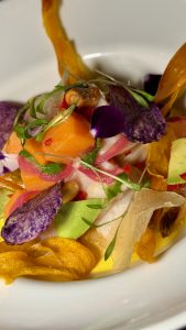 We started with pulutan-salty, spicy lumpia chips with vinegar dust, and freshly baked pandesal bread. Next, dynamite, a popular Filipino streetfood stuffed with Irish cheeses, and then pinakbet, a hearty vegetable stew. Bicol express is a popular Filipino dish known for its spicy coconutty sauce: rich and savoury, which complemented the meaty monkfish perfectly. Often considered the unofficial national dish in the Philippines, our vegetarian version of the adobo featured marinated oyster mushrooms with pineapple, chimichurri, and shallot, served with crispy potatoes and carrot and mooli tempura.