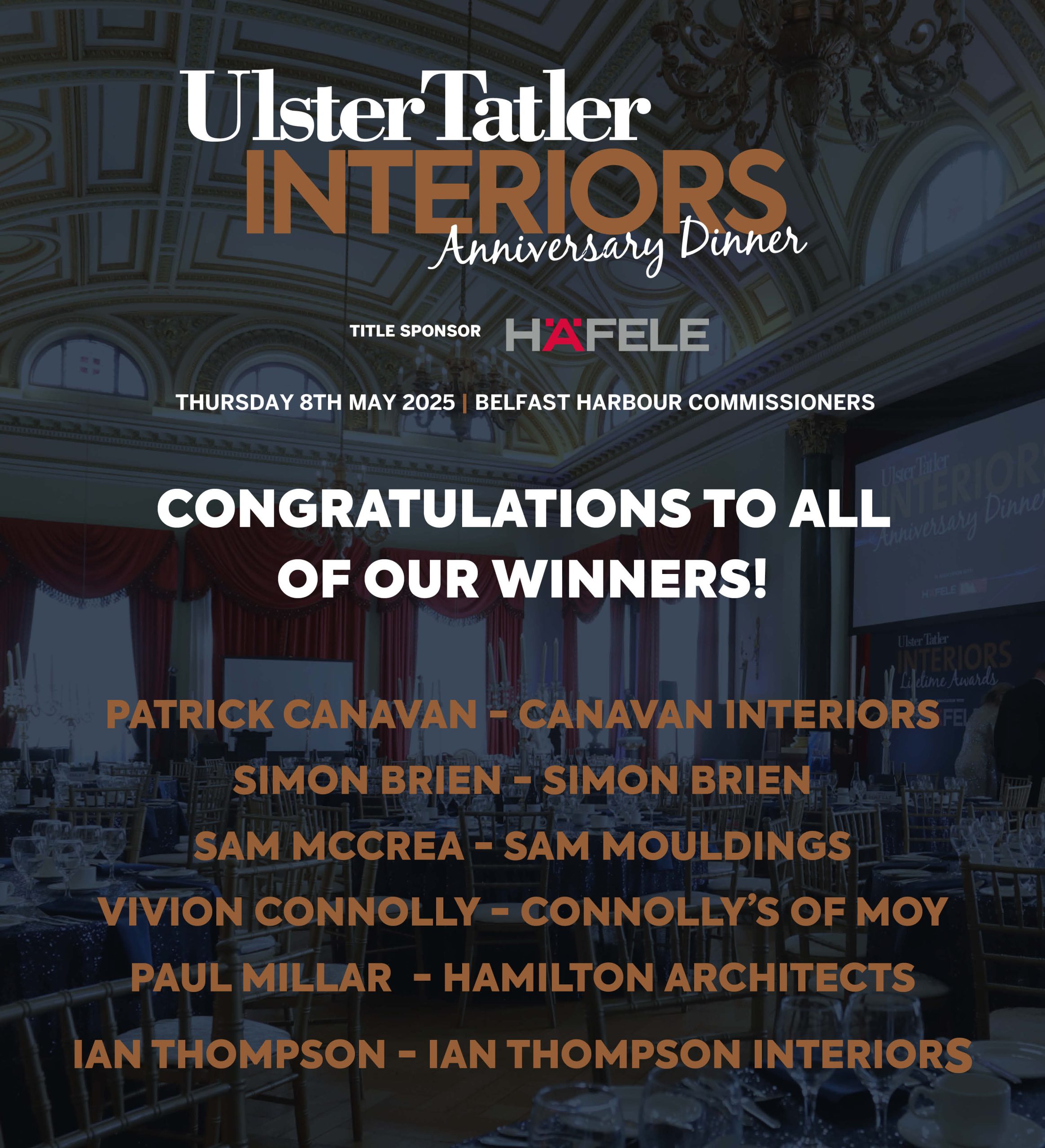 The Ulster Tatler Interiors Anniversary Dinner is now in its 7th year. The next awards are scheduled to take place on 21st May 2026 in the Harbour Commissioners’ Offices, Belfast. The awards were established by Ulster Tatler Interiors magazine to recognise significant figures in the interior design, architectural and construction sectors in Northern Ireland.